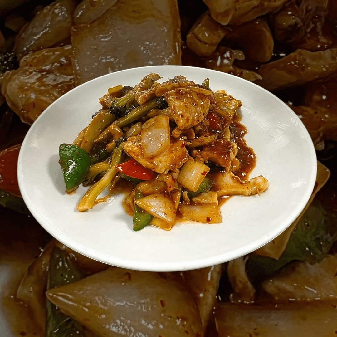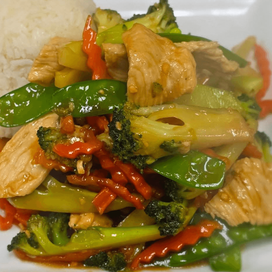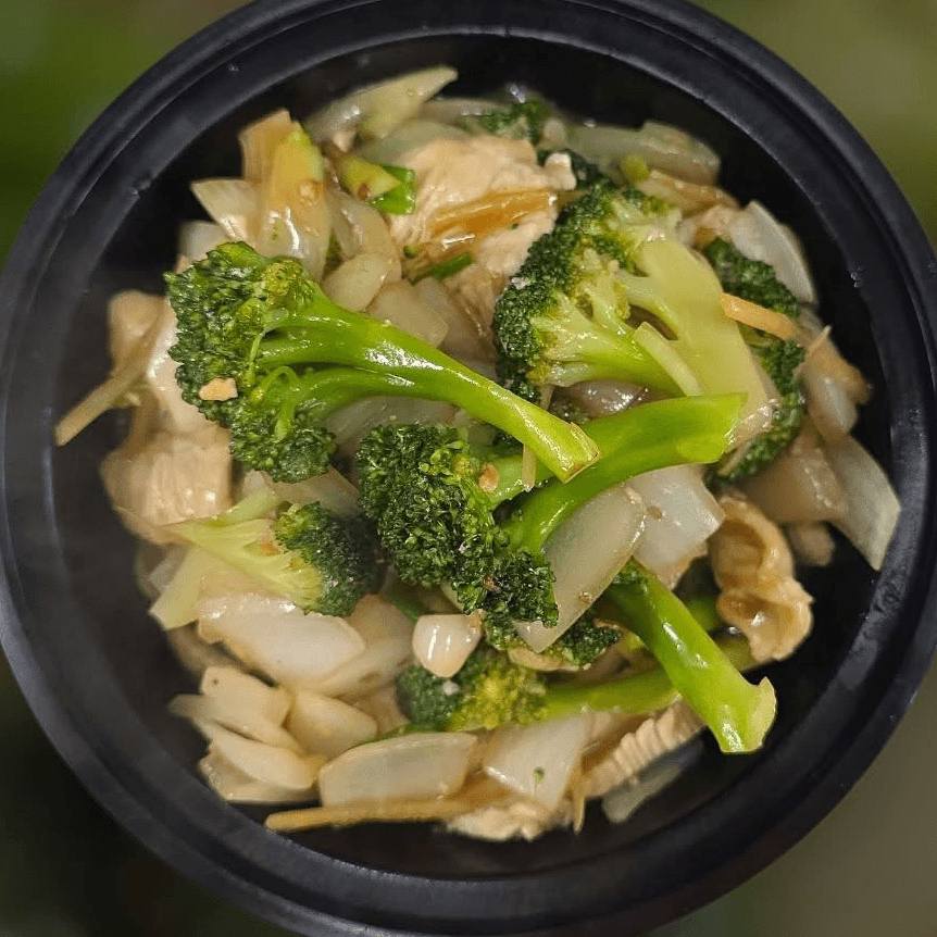 Ginger, broccoli, scallions and onions in a light brown sauce. Choose your protein and spice level.
