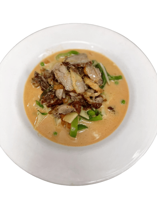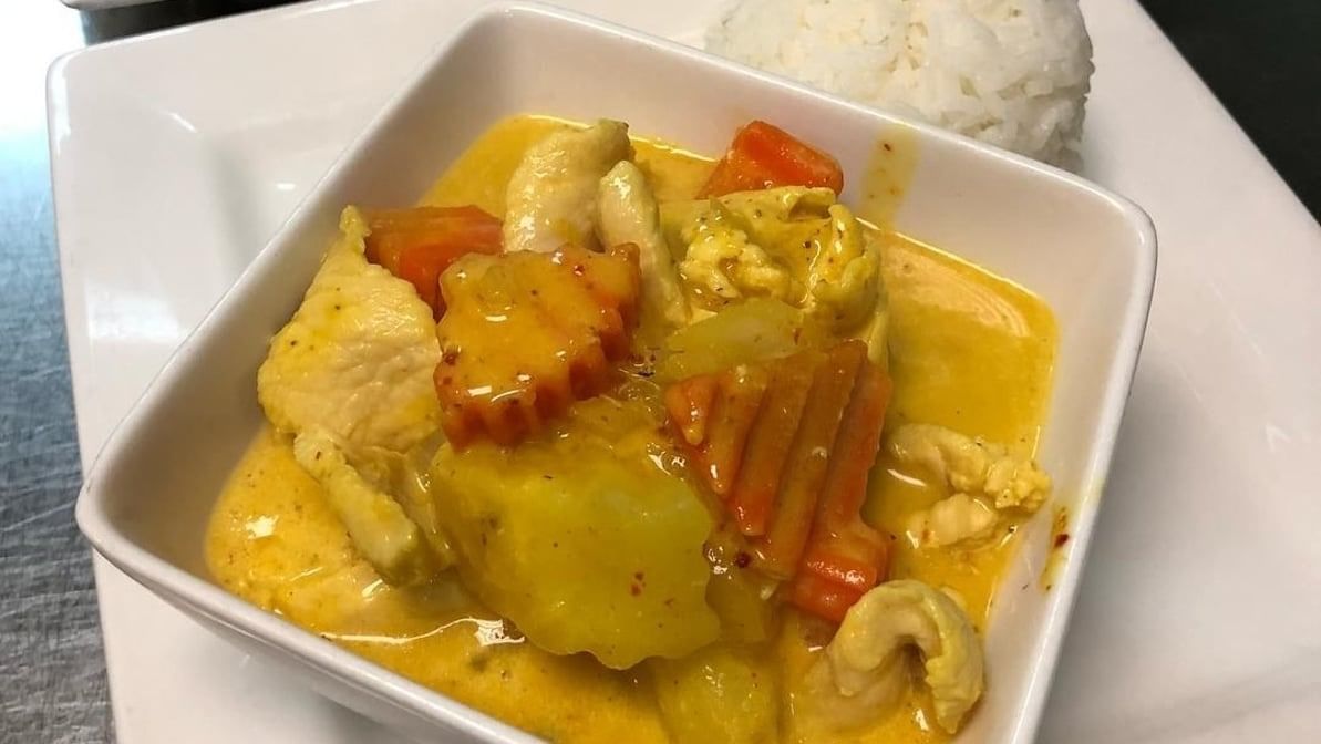 Little bit spicy. Slowly cooked with coconut cream potatoes, carrots, onions and topped with peanuts. Choose your protein.