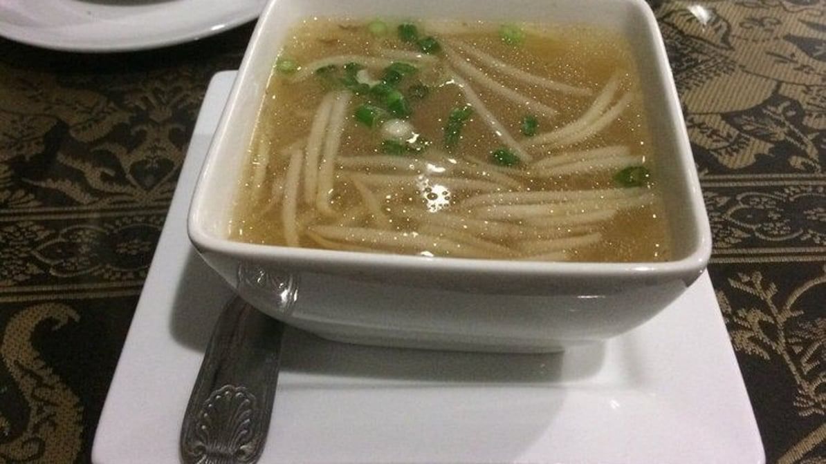 A subtle soup with chicken wontons, bean sprouts and scallions