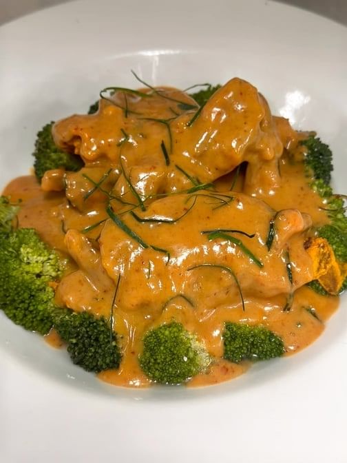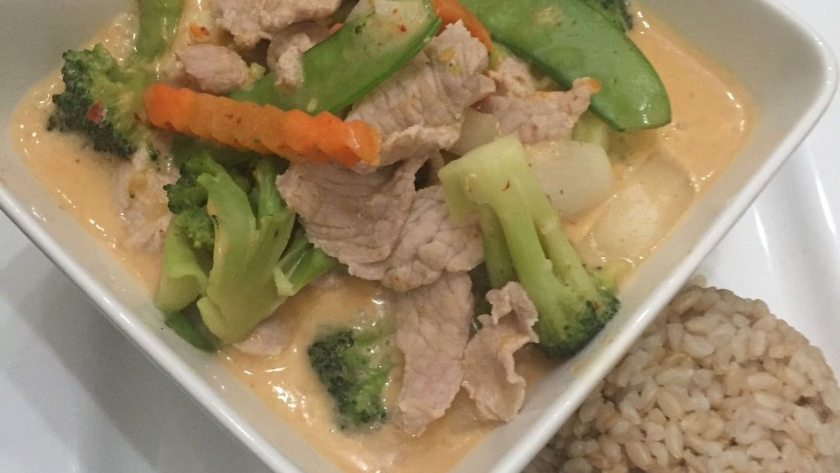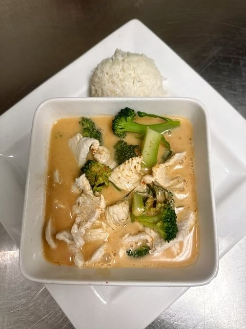 Little bit spicy. Slowly cooked with coconut cream and broccoli, lime leaves. Choose your protein.