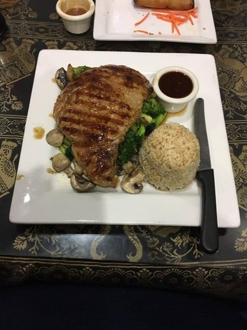Ribeye steak marinated and grilled in Thai seasonings, served with mixed vegetables and a side of Thai steak sauce
