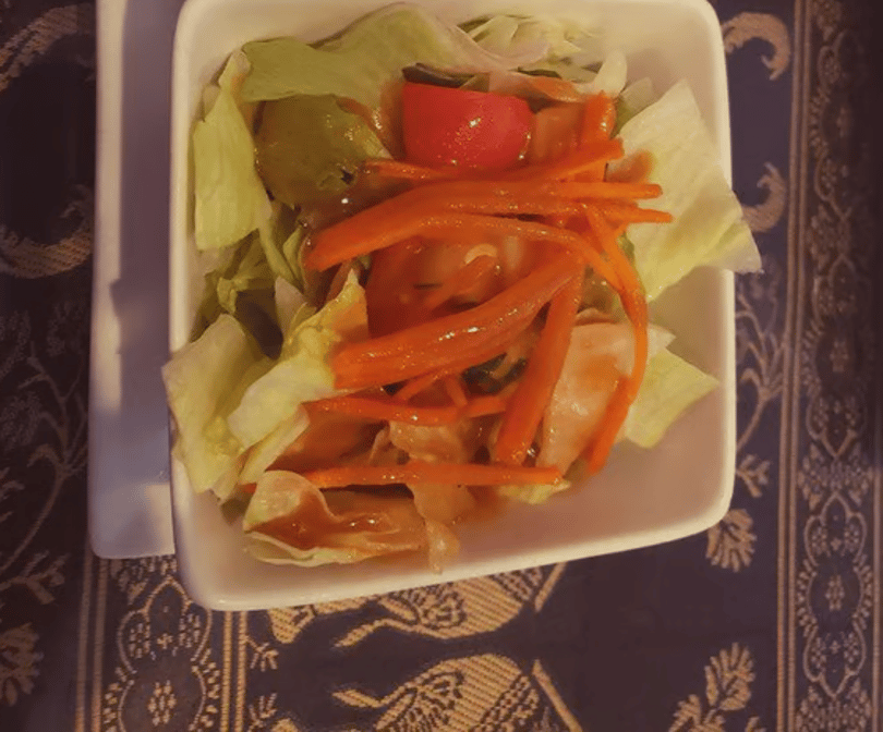 Small: lettuce, tomatoes, cucumber, tomatoes, and carrots topped with Thai peanut dressing. Large: tofu, onions, lettuce, cucumber, tomatoes, carrots with Thai peanut dressing