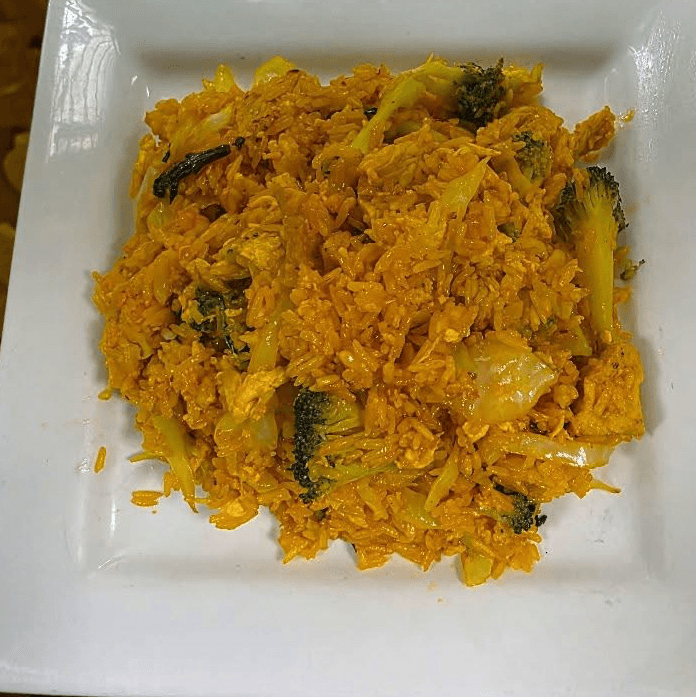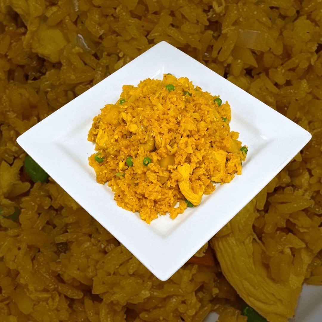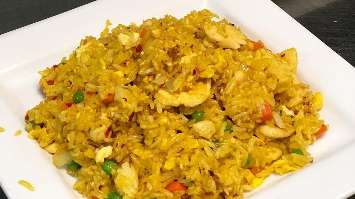 Stir fried rice with egg, peas, carrots and onions. Choose your protein and spice level.