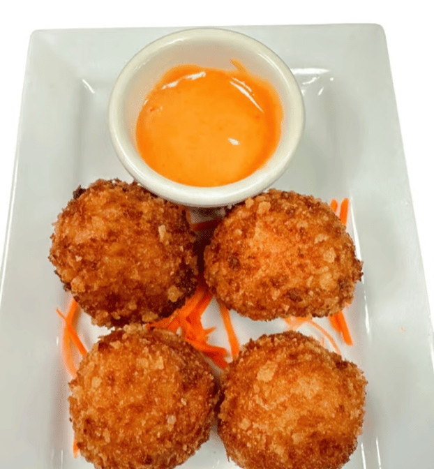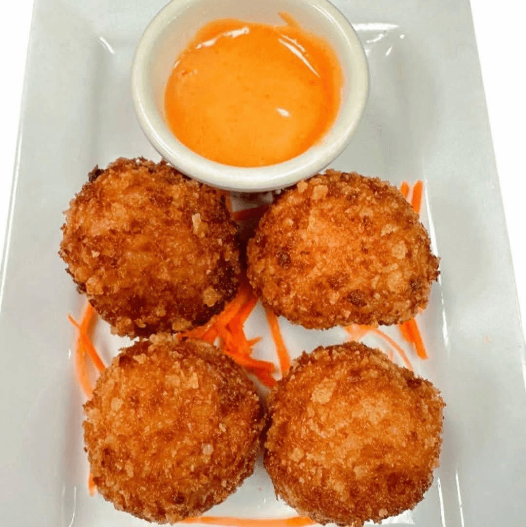 Enjoy 4 golden cheese risotto rice balls. Creamy rice and melted cheese wrapped in a light batter and deep-fried to perfection. Served with our signature shrimp sauce