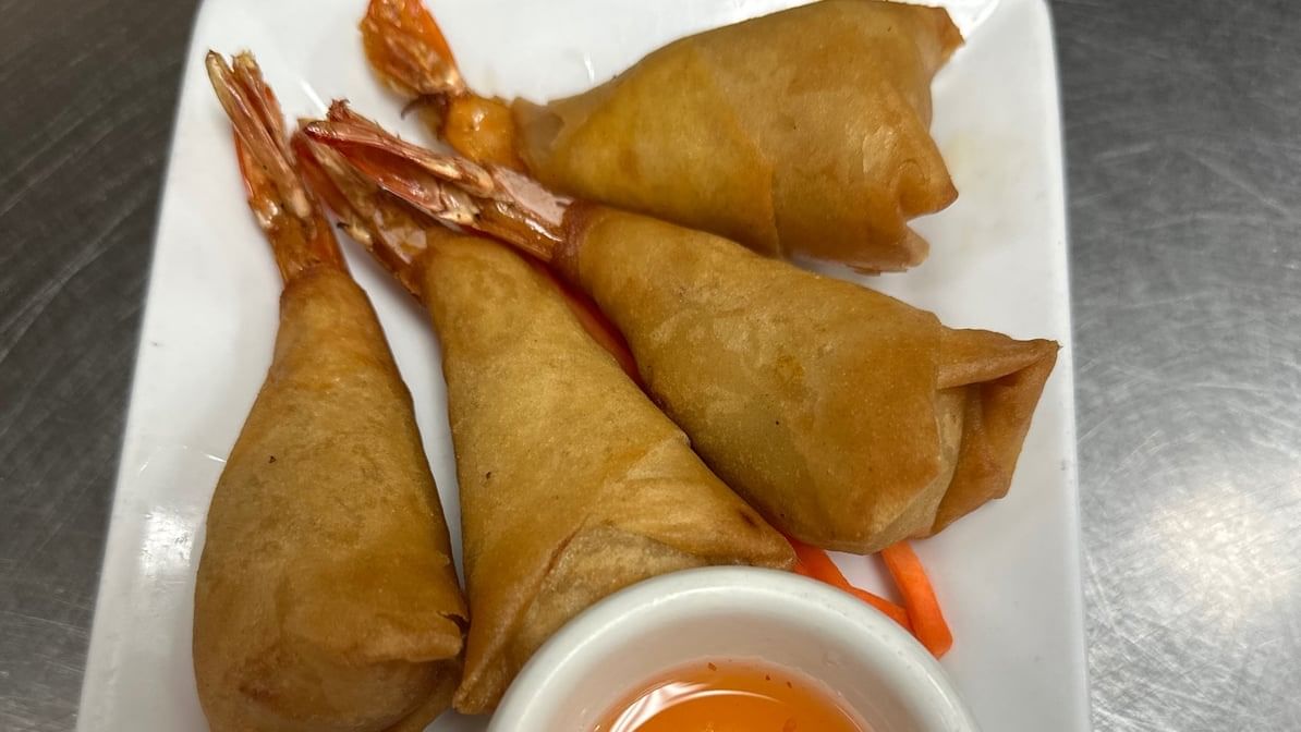Shrimp and seasoned mixed vegetables, wrapped in rice paper; deep fried, served with a sweet and sour sauce. 4 pieces