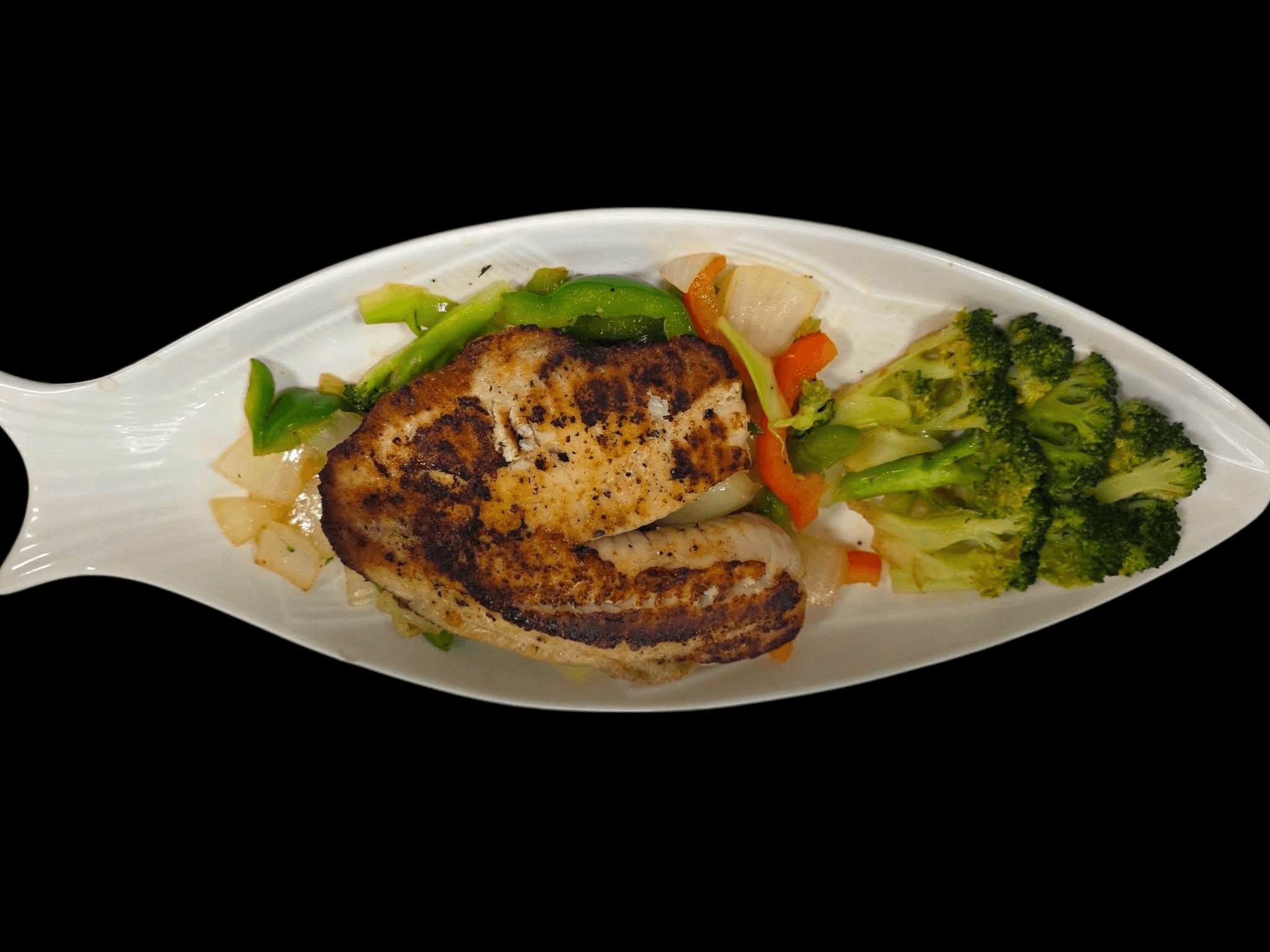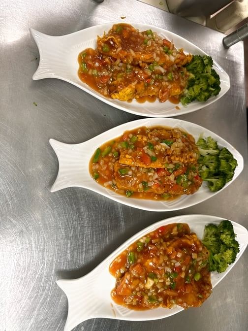 2 crispy fillets topped with a spicy, sweet and sour sauce, mixed with chopped onions, bell peppers and tomatoes, served with a side of broccoli