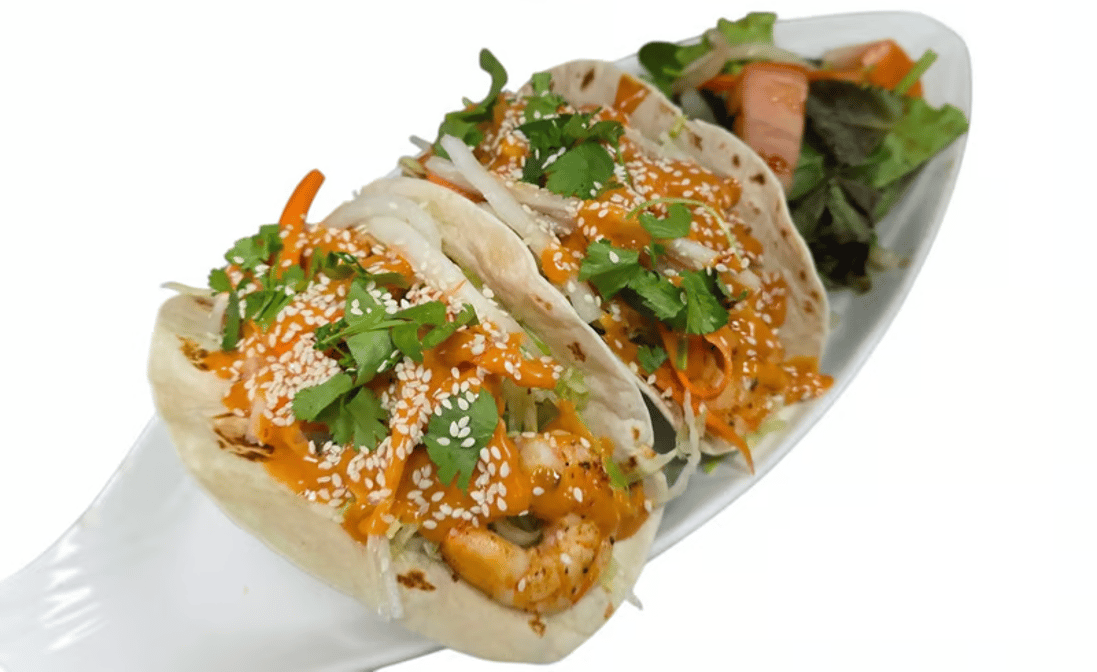 Grilled shrimp with shredded carrots, cilantro, and sesame seeds, drizzled with a tangy orange sauce, served in soft tortillas