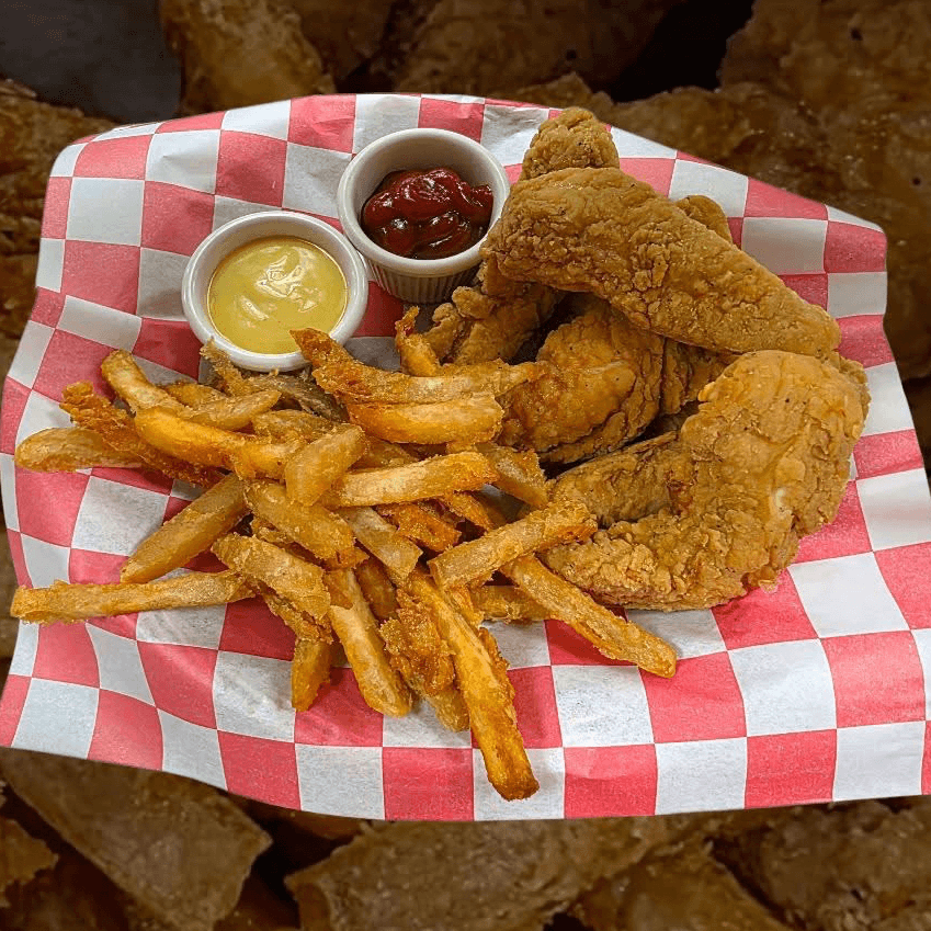 6 crispy battered chickens served with fries. Ketchup and honey mustard sauce
