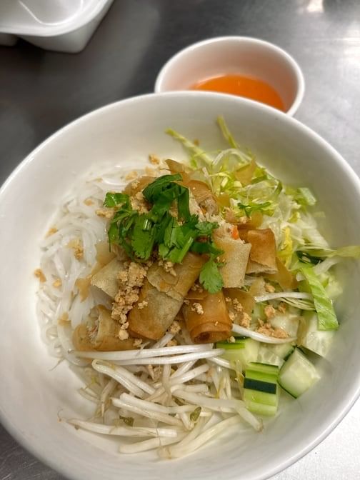 A house salad bowl layered with lettuce, rice noodles, cucumbers, bean sprouts, cilantro, peanuts and spring rolls topped with our house sweet and sour