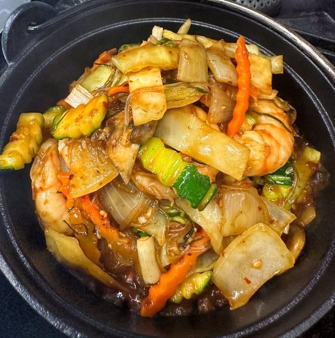 Savory shrimp stir-fried with zucchini, carrots, onions, and bell peppers in a rich, aromatic sauce