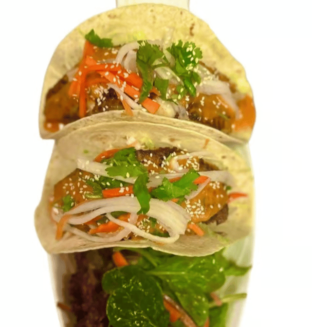 Grilled fish topped with shredded carrots, cilantro, onions, and sesame seeds, served in soft tortillas