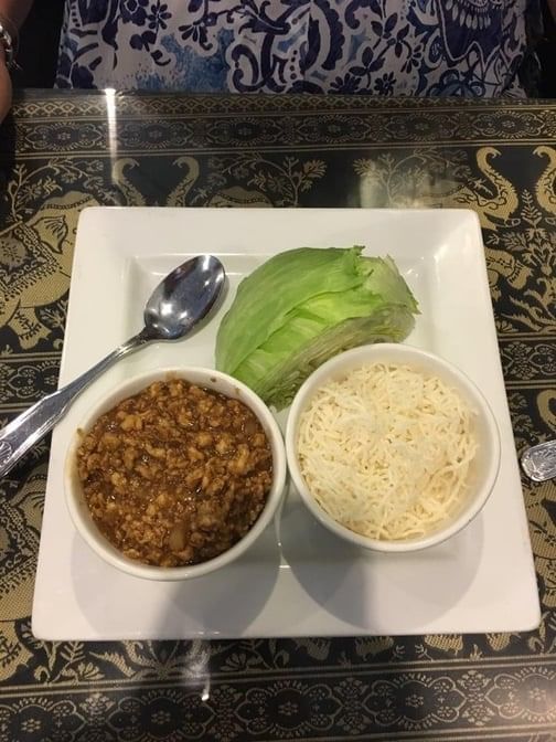 Sautéed chicken, onions, garlic with Thai flavors; served with crispy noodles and wedges of lettuce