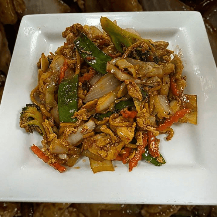 Broccoli, zucchini, carrots, cabbage, scallions, onions, snow peas and bean sprouts in a light brown sauce. Choose your protein and spice level.