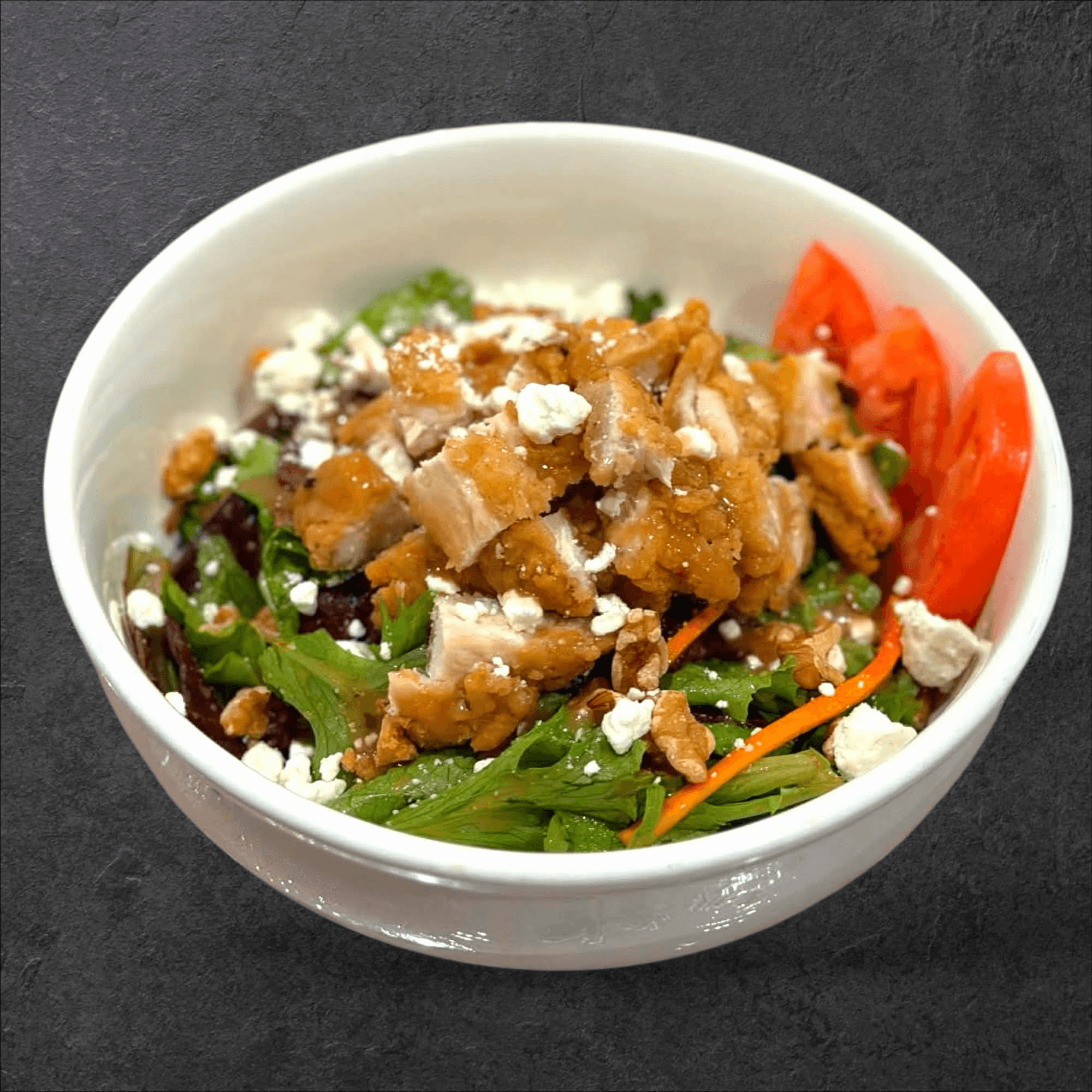 Walnuts, goat cheese, red onion, tomatoes, pickled carrots & daikon, balsamic vinaigrette on top with 2 pieces crispy chicken