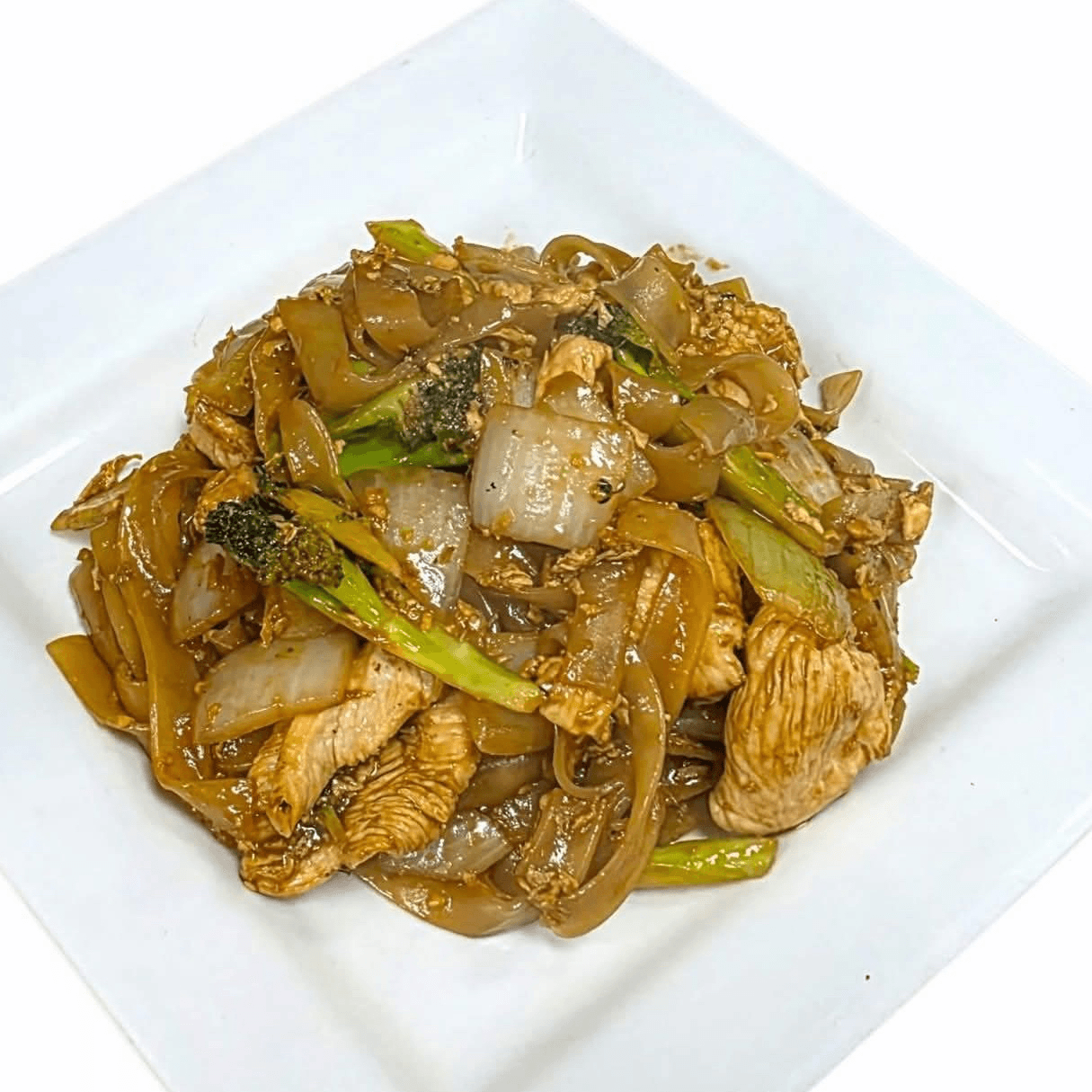 Stir fried wide rice noodles sautéed with egg, broccoli and onions in a sweet soy sauce. Choose your protein and spice level.