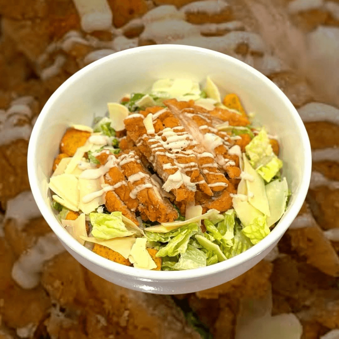 Classic Caesar salad lettuce, croutons, Parmesan cheese on top with 2 pieces crispy chicken