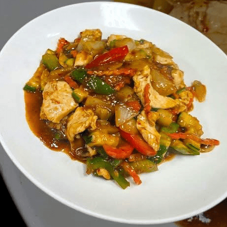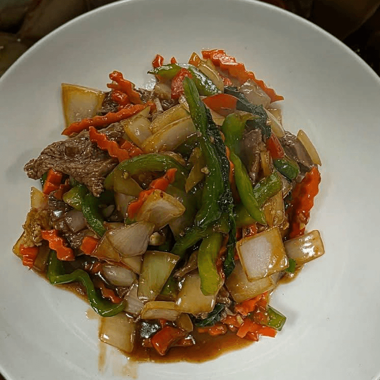 Sliced flank steak stir fried with bell peppers and onions in a light brown sauce. Choose your protein and spice level.