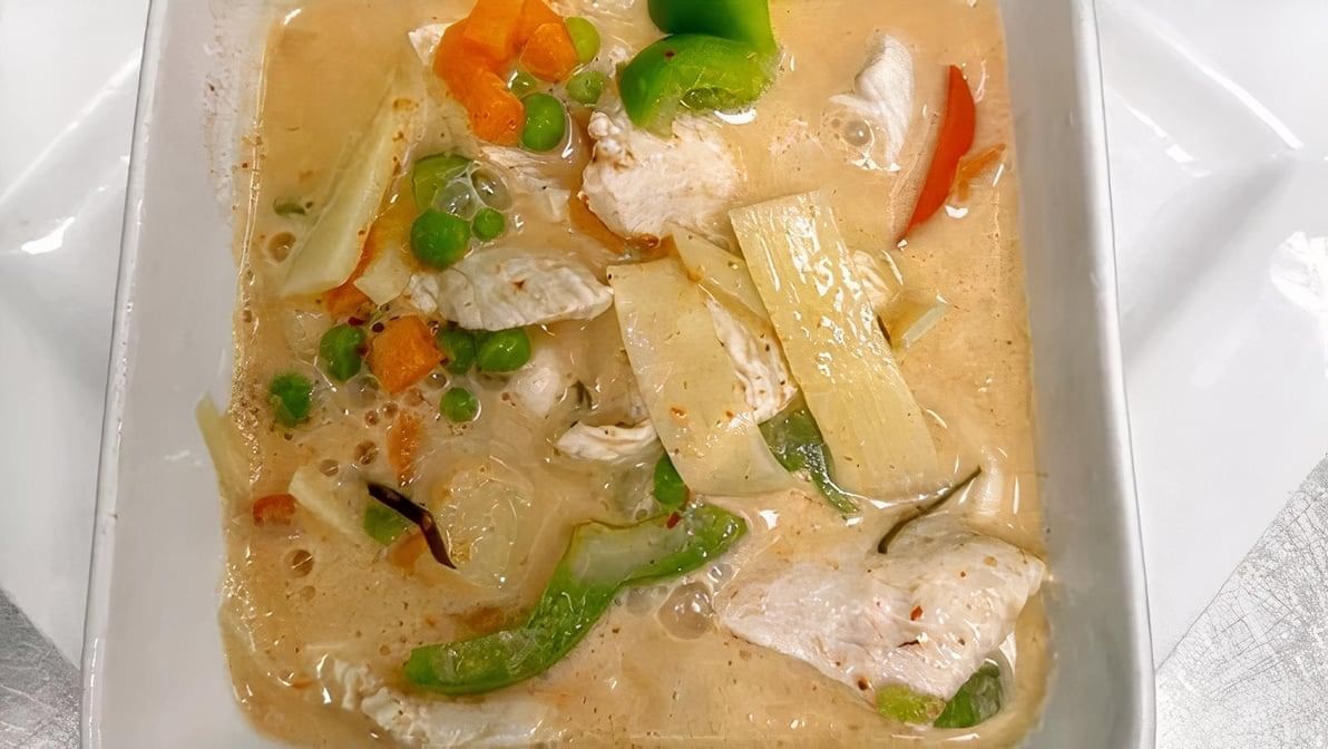Little bit spicy. Slowly cooked with coconut cream bamboo shoots, peas, carrots, bell peppers, and basil, lime leaves. Choose your protein.