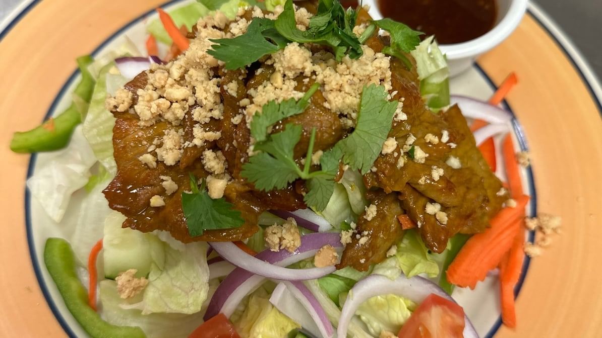 Lettuce, cucumbers, tomatoes, bell peppers, onions, peanuts and cilantro topped with a Thai chili vinaigrette dressing. Add grilled beef and shrimp for an additional charge
