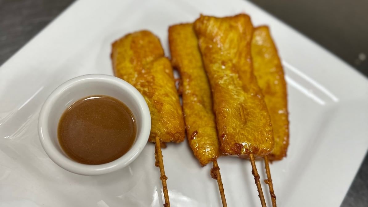 Marinated on skewers, grilled to perfection with a light glaze of coconut cream; served with peanut sauce and diced cucumbers. 4 pieces