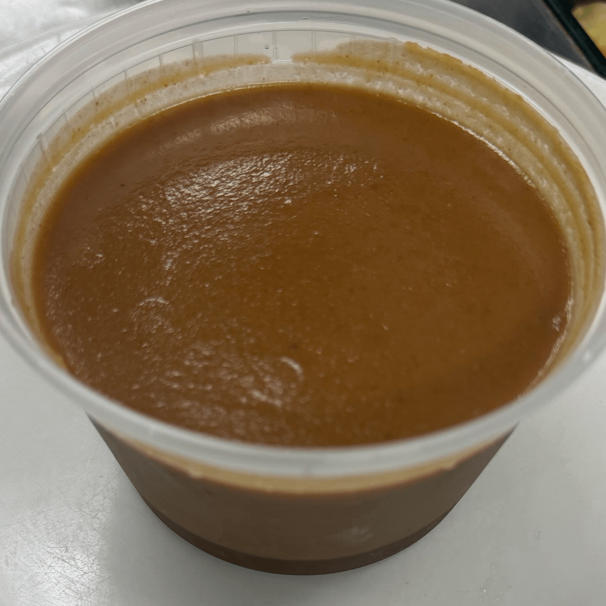 Serving of our housemade peanut sauce, combining creamy peanut butter with coconut milk and a blend of traditional Thai spices for a rich and smooth texture