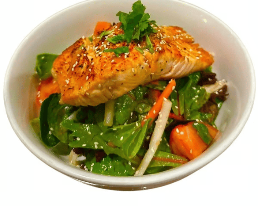 Grilled salmon on mixed greens with carrots, tomatoes, and sesame seeds, garnished with fresh cilantro