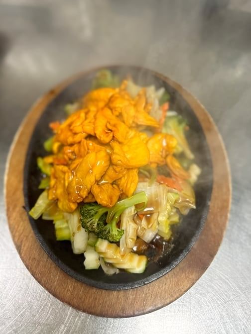 Our choice of grilled chicken, or seafood combination on top of mixed vegetables. Glazed with teriyaki sauce on a sizzling hot plate